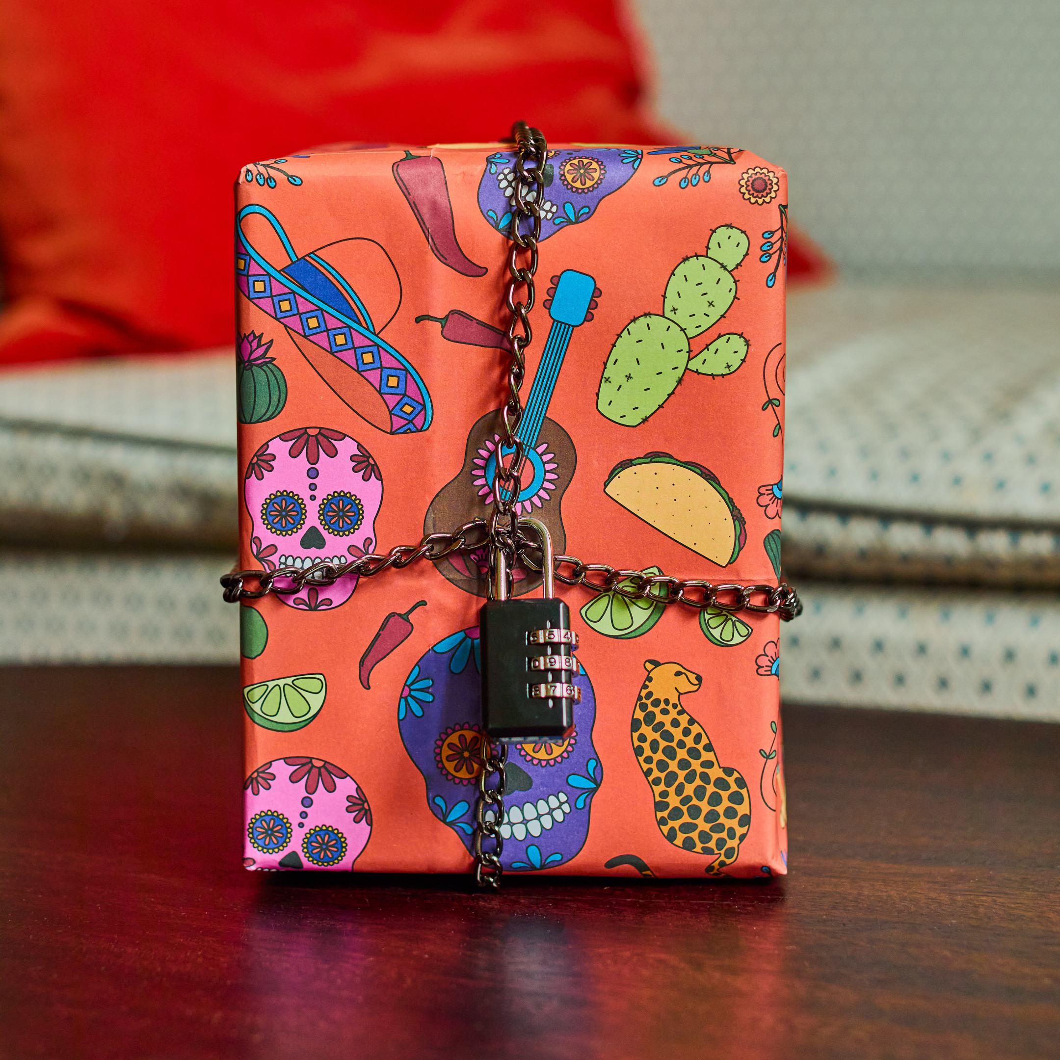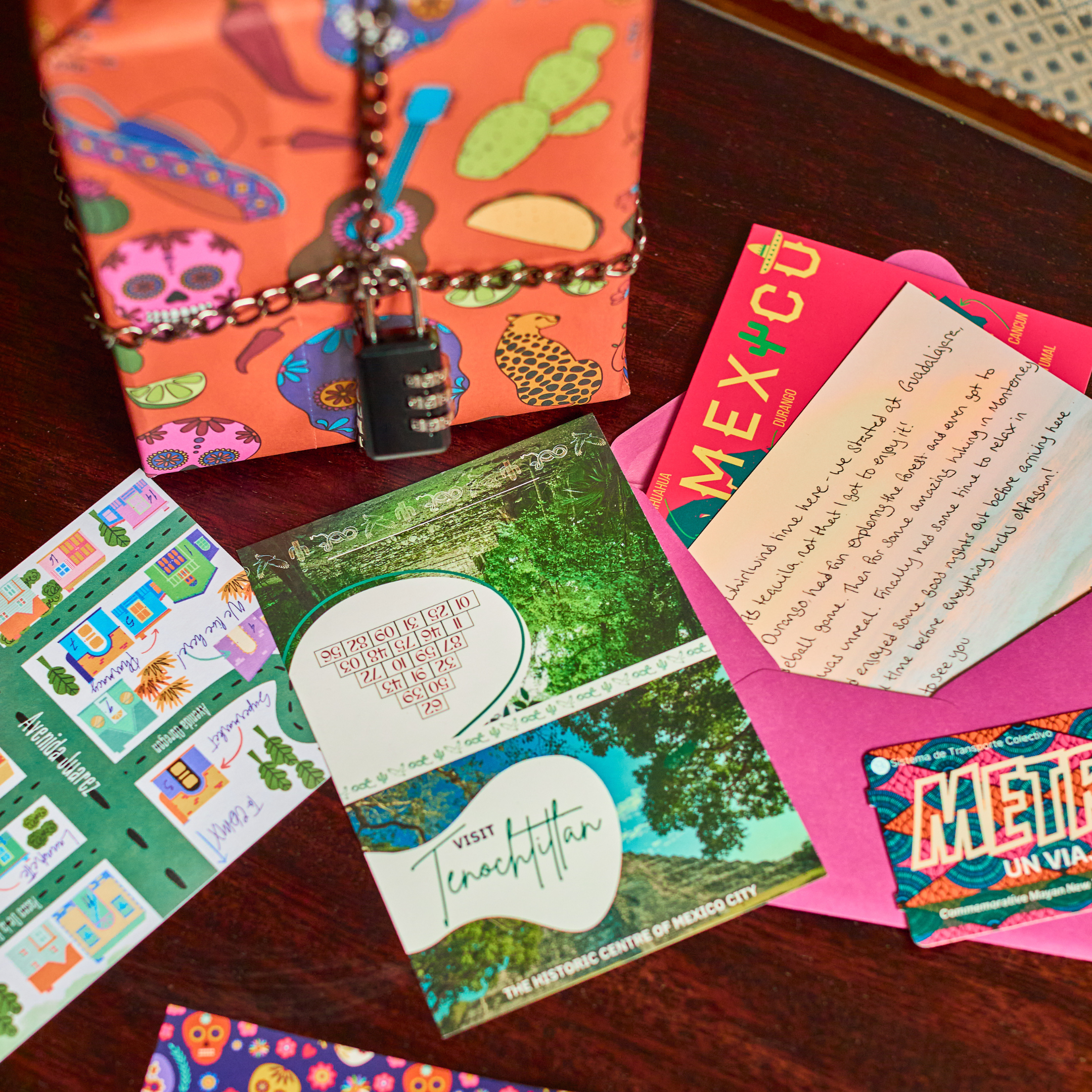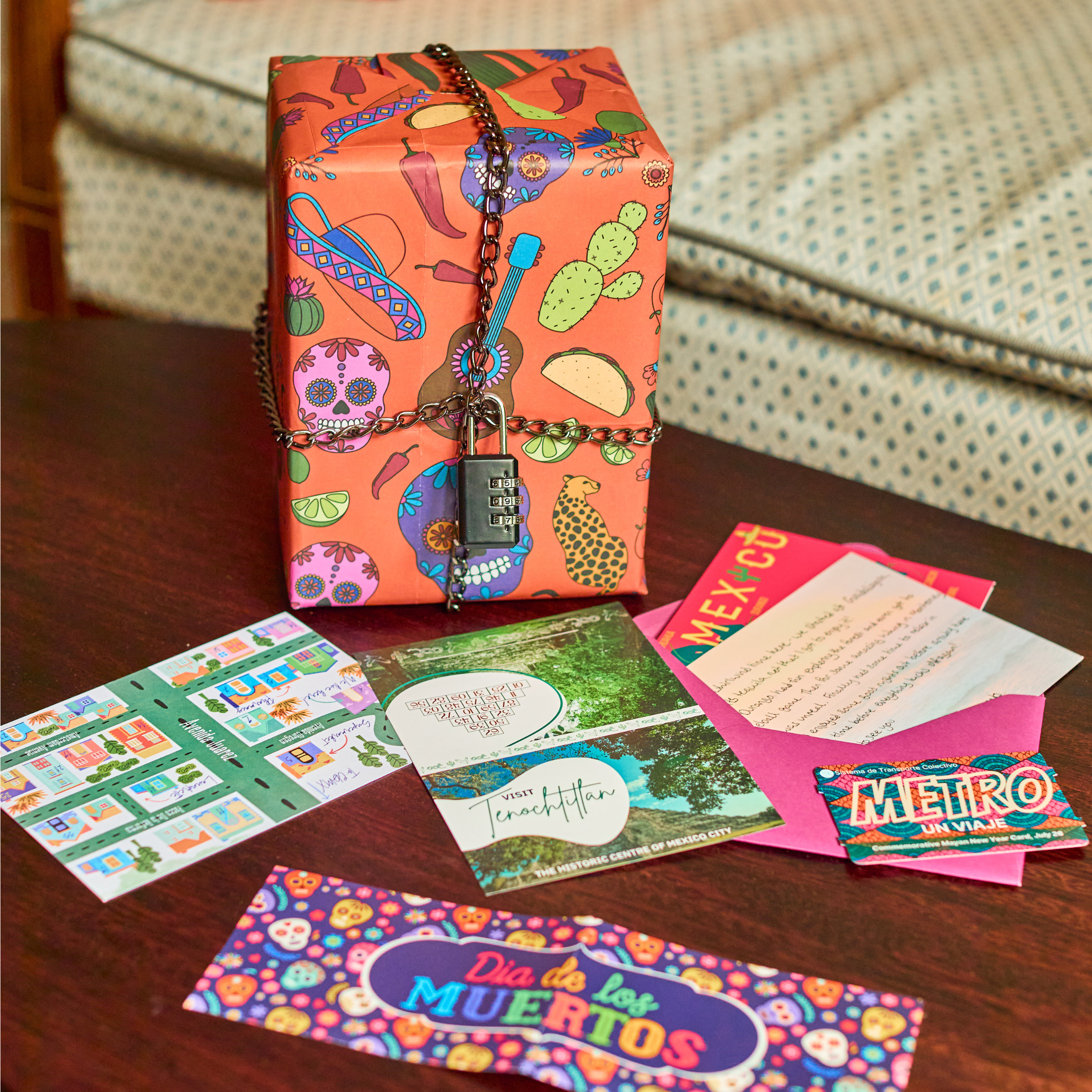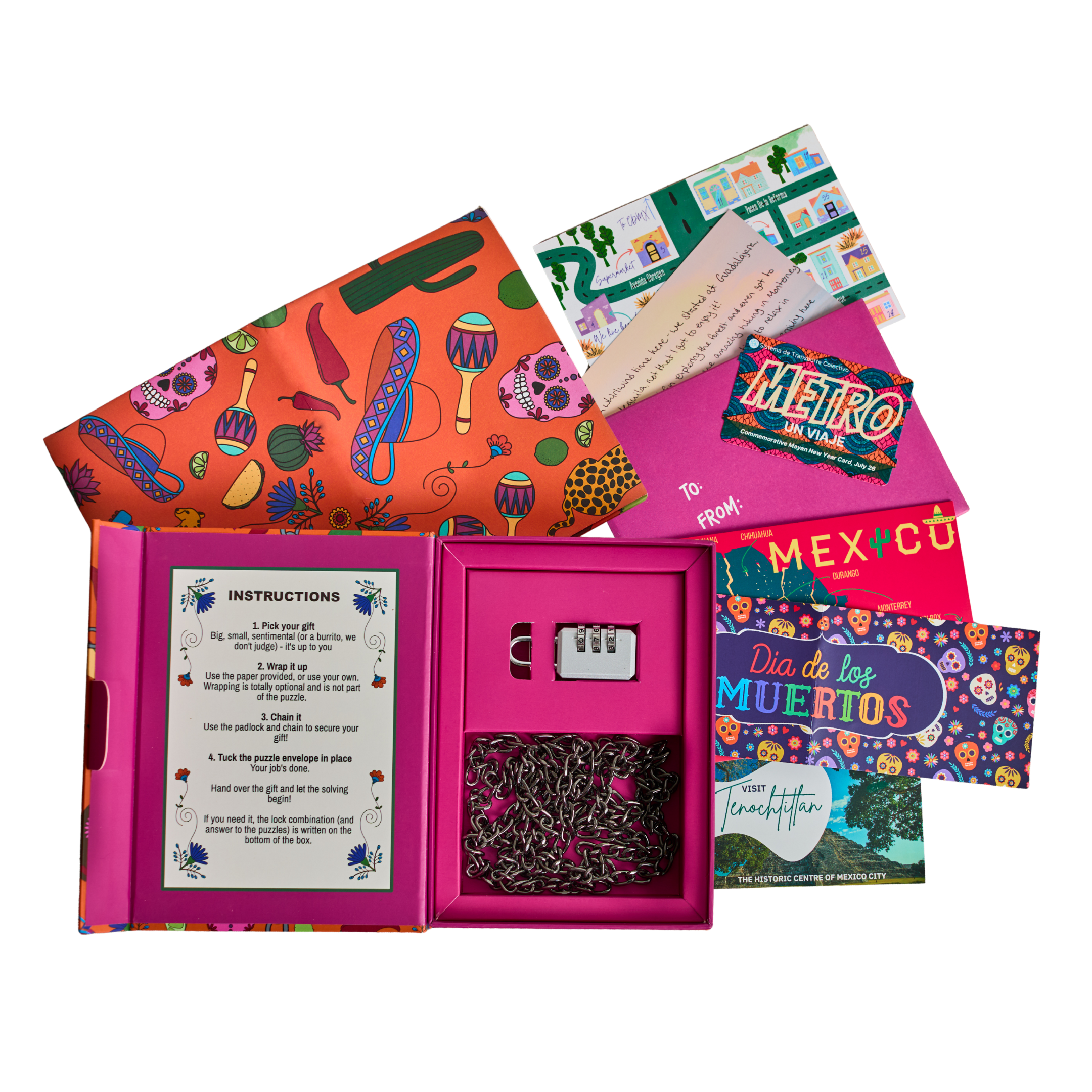 This puzzle game was dreamt up under the Mexican sun - inspired by vibrant street food, Día de los Muertos colours, and long afternoons on sandy beaches. Inside is a lock, a chain, wrapping paper and five handcrafted puzzles. Solve the puzzles to reveal the lock's combination.