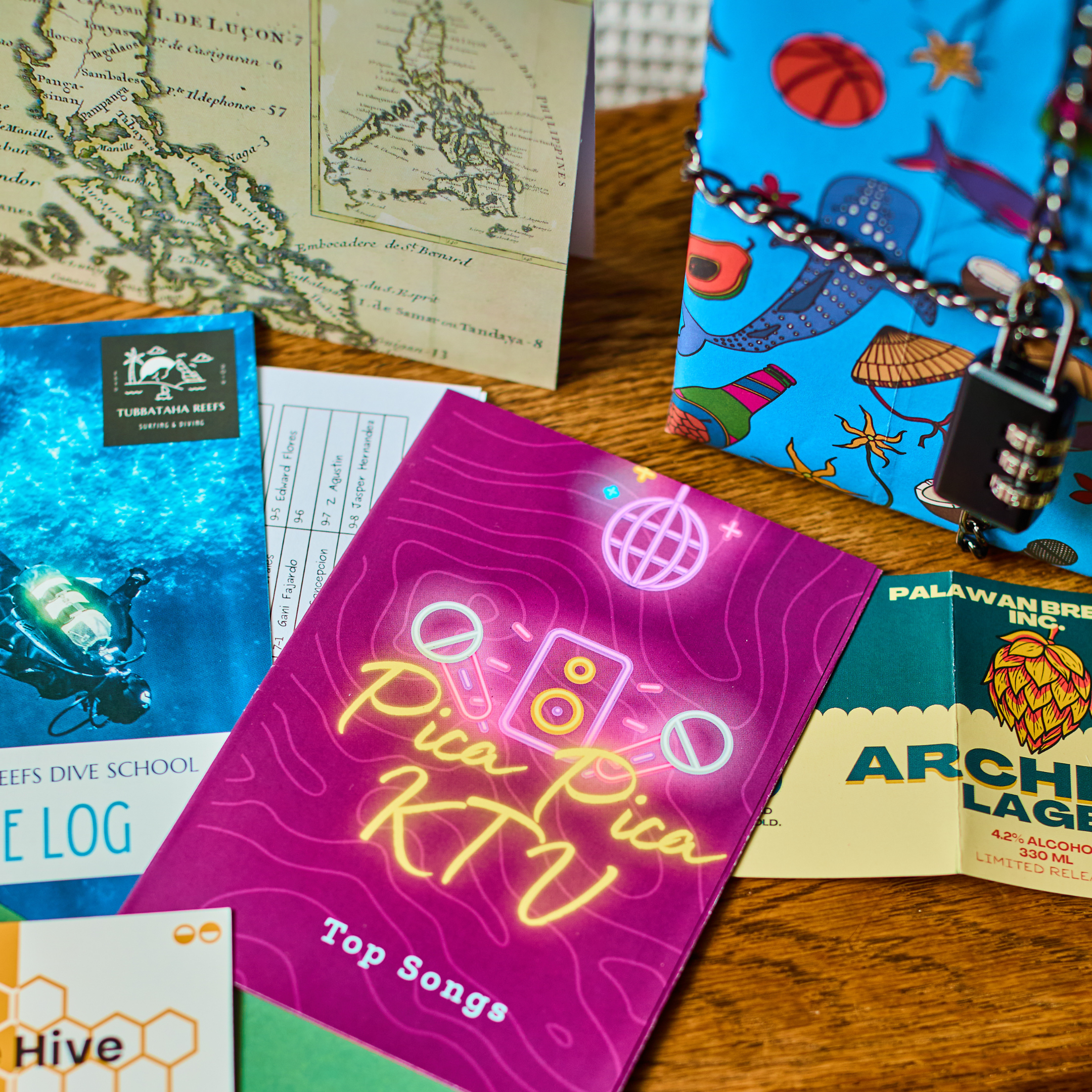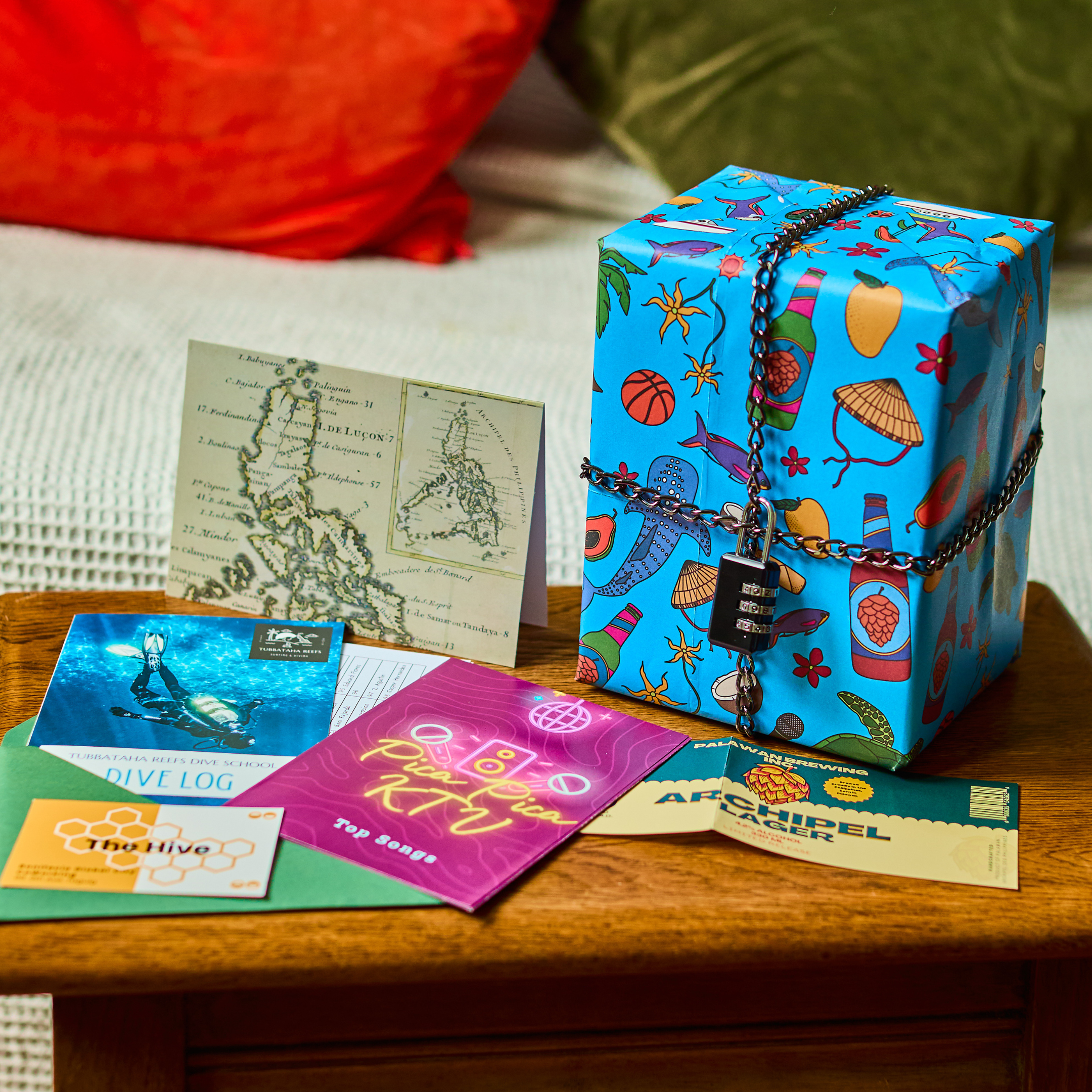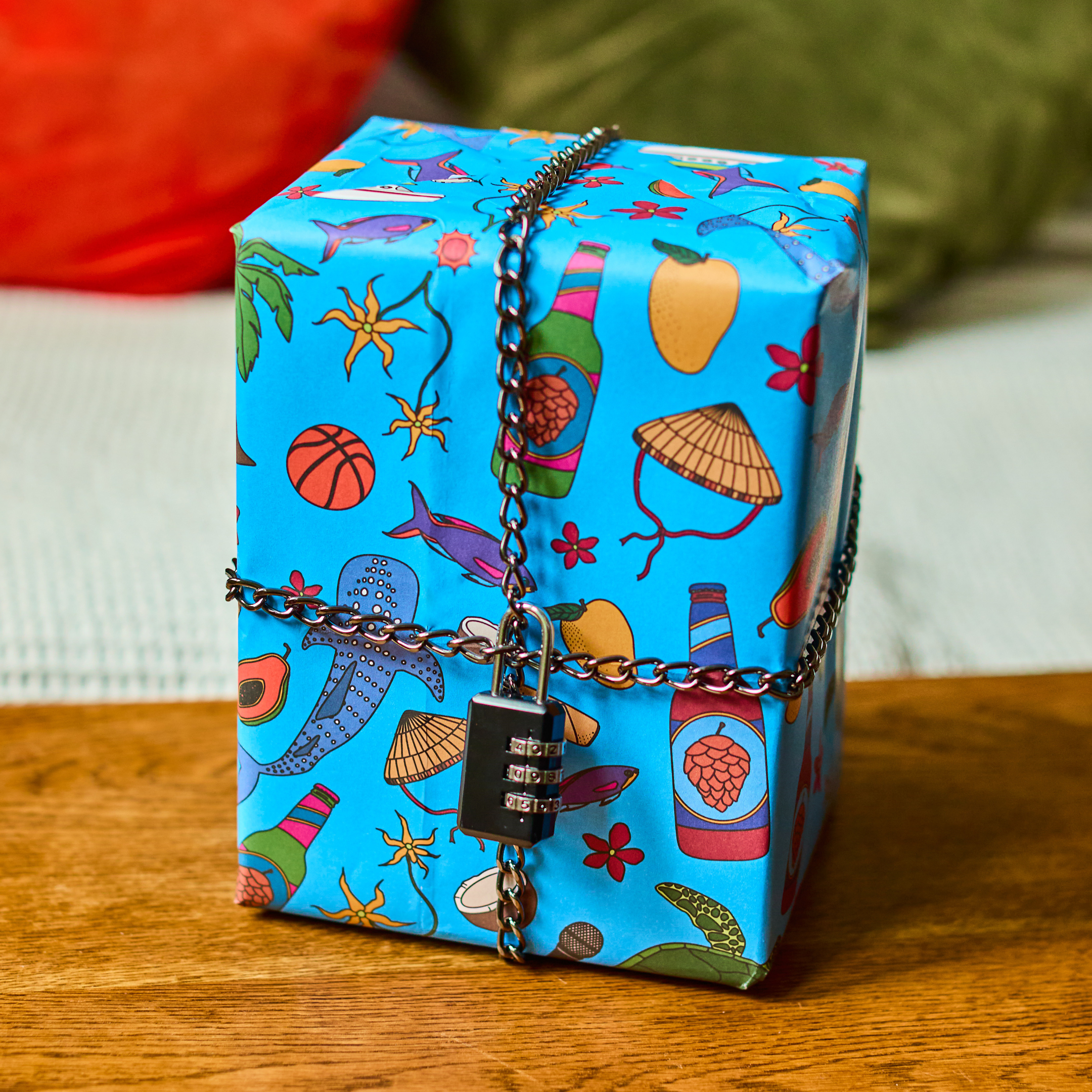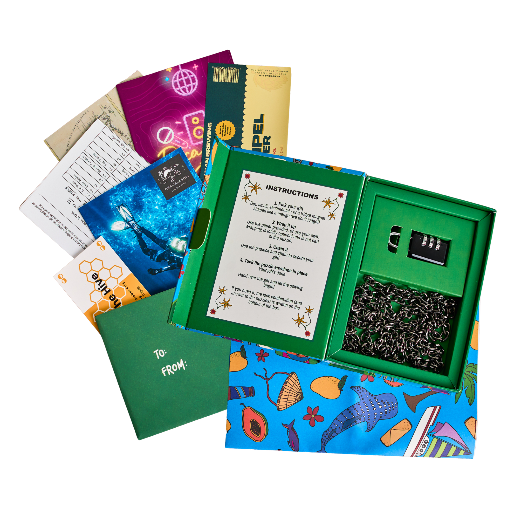 This puzzle game was imagined somewhere between a sunset swim and a karaoke marathon, all whilst enjoying a cold bottle of local lager. Inside is a lock, a chain, wrapping paper and five handcrafted puzzles. Solve the puzzles to reveal the lock's combination.